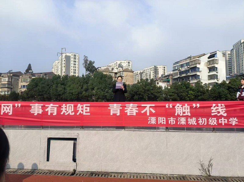 为进一步增强未成年人网络安全意识,近日,溧阳市检察院“萌竹·溧检”法治巡讲团成员刘聪谚应邀前往溧阳市溧城初级中学,在庄严的国旗下,以“‘网’事有规矩,青春不‘触’线”为主题为全校师生作讲话。